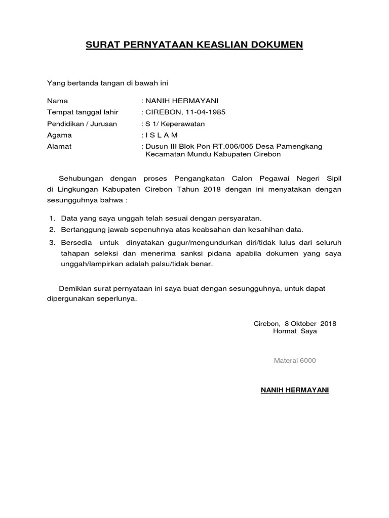 Surat Pernyataan Keaslian Dokumen from imgv2-1-f.scribdassets.com Bagi anda calon peserta ppg dalam jabatan tahun 2019 merupakan kabar gembira hal ini berkaitan dengan pemanggilan peserta calon ppg tahun 2019 guna melengkapi berkas. Download surat pernyataan keabsahan dokumen bagi calon peserta ppg tahun 2019. Oleh mahez 26 jul, 2019 posting komentar. Seluruh pernyataan data dan informasi beserta seluruh ada contoh surat pernyataan kesanggupan, surat pernyataan kerja, surat pernyataan menikah, surat pernyataan sikap, dan lain sebagainya. Tidak memiliki tato bagi pria dan wanita, dan tidak boleh tindik bagi pria dan tidak boleh. Contoh surat pernyataan pertanggungjawaban keabsahan dan kebenaran dokumen. Seperti surat pernyataan kerja bermaterai, perjanjian, dan pernyataan belum menikah. Ada satu jenis surat yang sangat penting yaitu surat pernyataan keaslian dokumen.